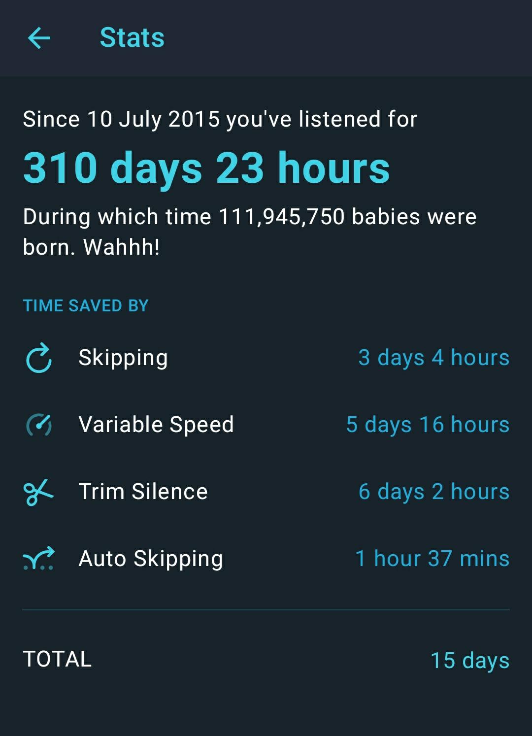 Now on to the freak shit. I listen to what I would describe as an embarassing amount of podcasts in a week. I’ve been using Pocket Casts for this since July of 2015, and its Stats page informs me that I have listened to 310 days of podcasts since then, or 7440 hours. Back in my depressed teen days I averaged over 3 hours per day, which has since dropped down to a more modest 1 hours and 50 minutes. This is how I gained my geographically ambiguous accent and why I know anything at all about skyscrapers, nazis, cursed AI startups and the types of pseudoscience currently big on Instagram. Listening to one or two podcast episodes without an App isn’t too difficult, but listening to a dozen quickly becomes too much friction to bother sticking with. This is why I was delighted to learn that gPodder still works, and still lets you sync your mp3 files to a Device as it did in 2013.